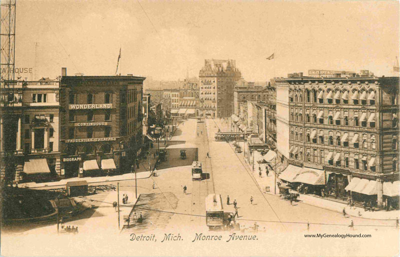 A vintage postcard of Monroe Avenue, Detroit, Michigan. Note the building at left with the sign: Wonderland Continuous Vaudeville Theatre. All of the vehicles are either horse drawn or are street cars. This postcard is from about 1905.
