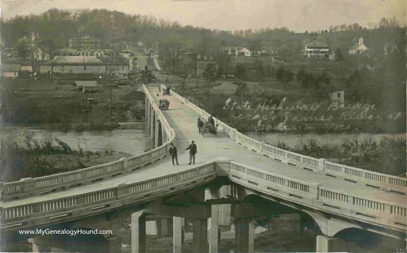 A vintage postcard view of the State Highway Bridge across the James River, Galena, Missouri. Note the uncommon "Y" design of the bridge. The downtown business area of Galena is in the background. This postcard view was postmarked in 1930.