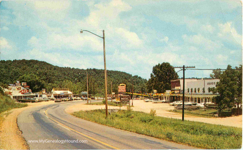 A vintage postcard view of businesses along the highway at Gravois Mills, Missouri. Signs that can be read include Gravois Super Market, Cafe, Motel, and beer signs. This postcard view is from about the 1960's.