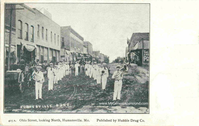 A vintage postcard of the Humansville Band on Ohio Street Looking North, Humansville, Missouri. This postcard view was postmarked in 1908. The card was published by Hubble Drug Co.