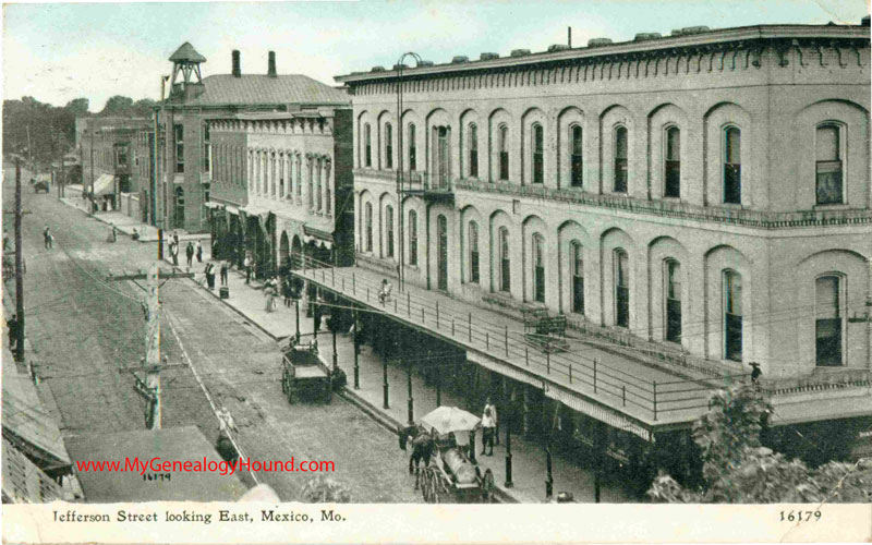A vintage postcard view of Jefferson Street, Looking East, Mexico, Missouri. Numerous business buildings line the side of the dirt street. The horse and wagon in the foreground is likely a water wagon used to sprinkle the streets to hold down the dust. This postcard is postmarked 1914.
