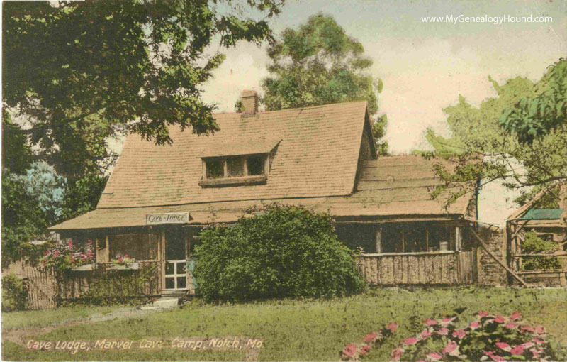 A vintage postcard view of the Cave Lodge, Marvel Cave Camp, Notch, Missouri. This cave was the nucleus of what was later developed into the Silver Dollar City Amusement Park, west of Branson, Missouri. This postcard view is from about the late 1920's - early 1930's.